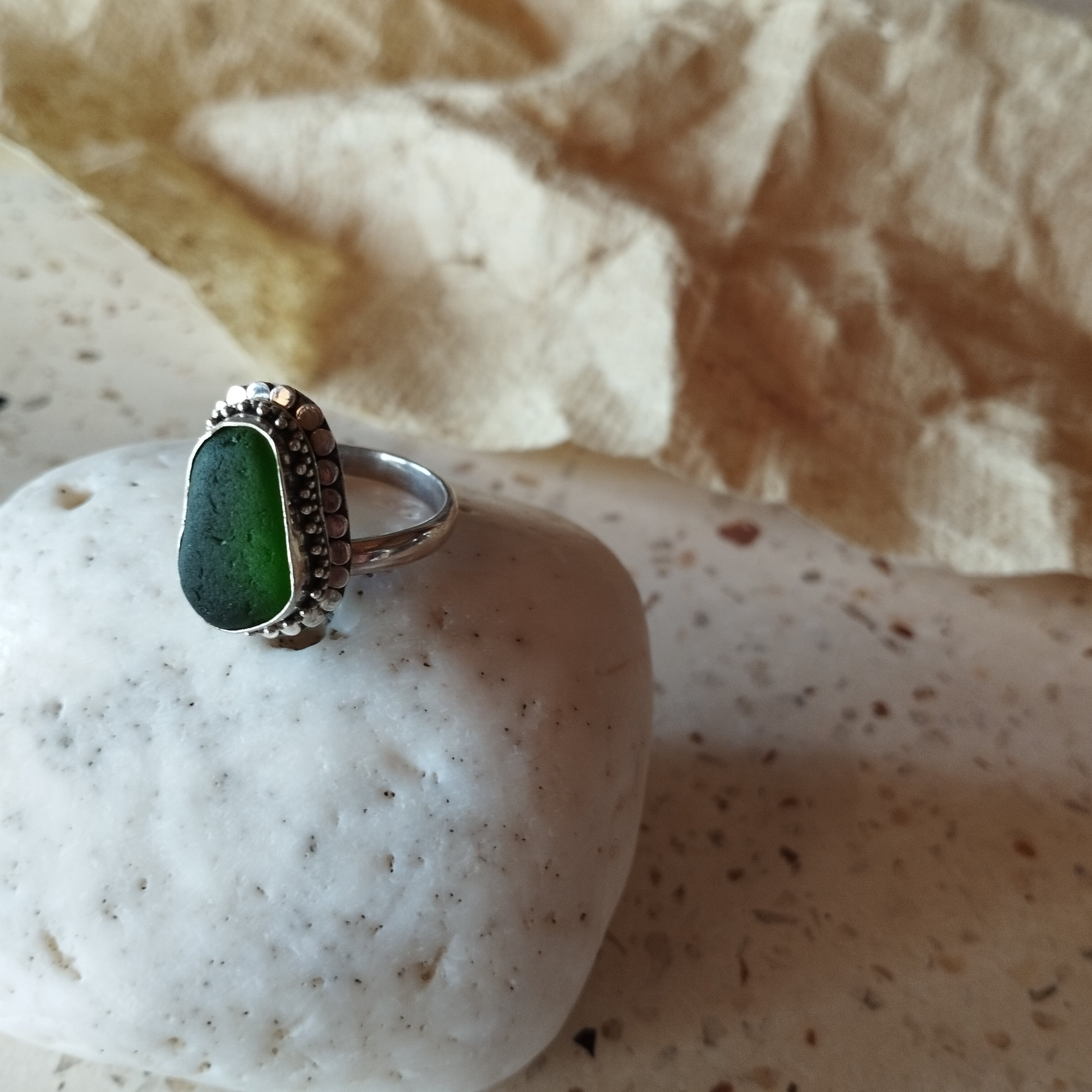 バリ島のビーチで見つけた世界に1つのシーグラスのシルバー925リングです。